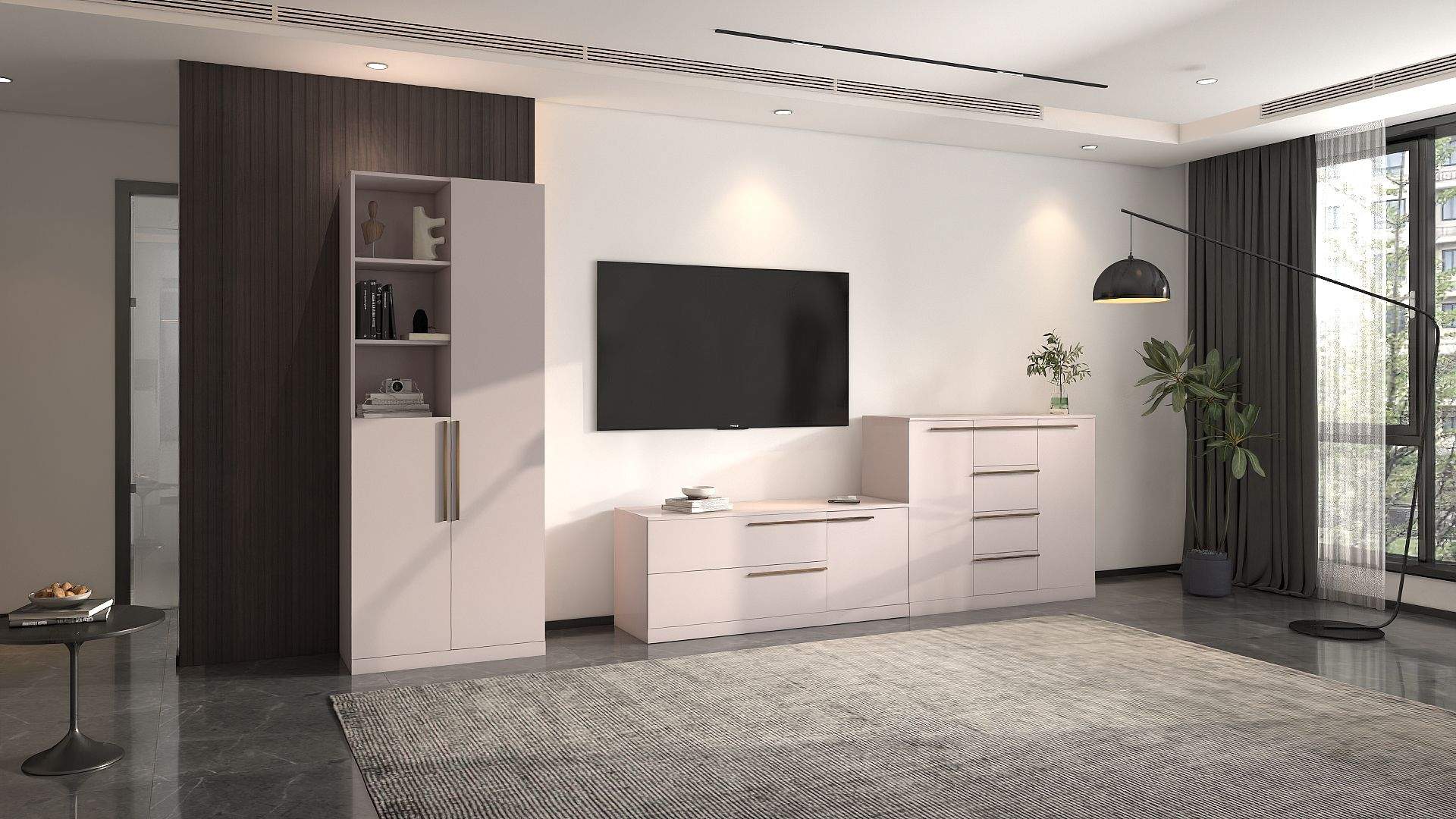 Размеры: 300x300, h200 cм. Цена указана за: Стеллаж (800х450, h2000 мм), тумба ТВ (1500х450, h550 мм) + комод (1200х450, h1000 мм).