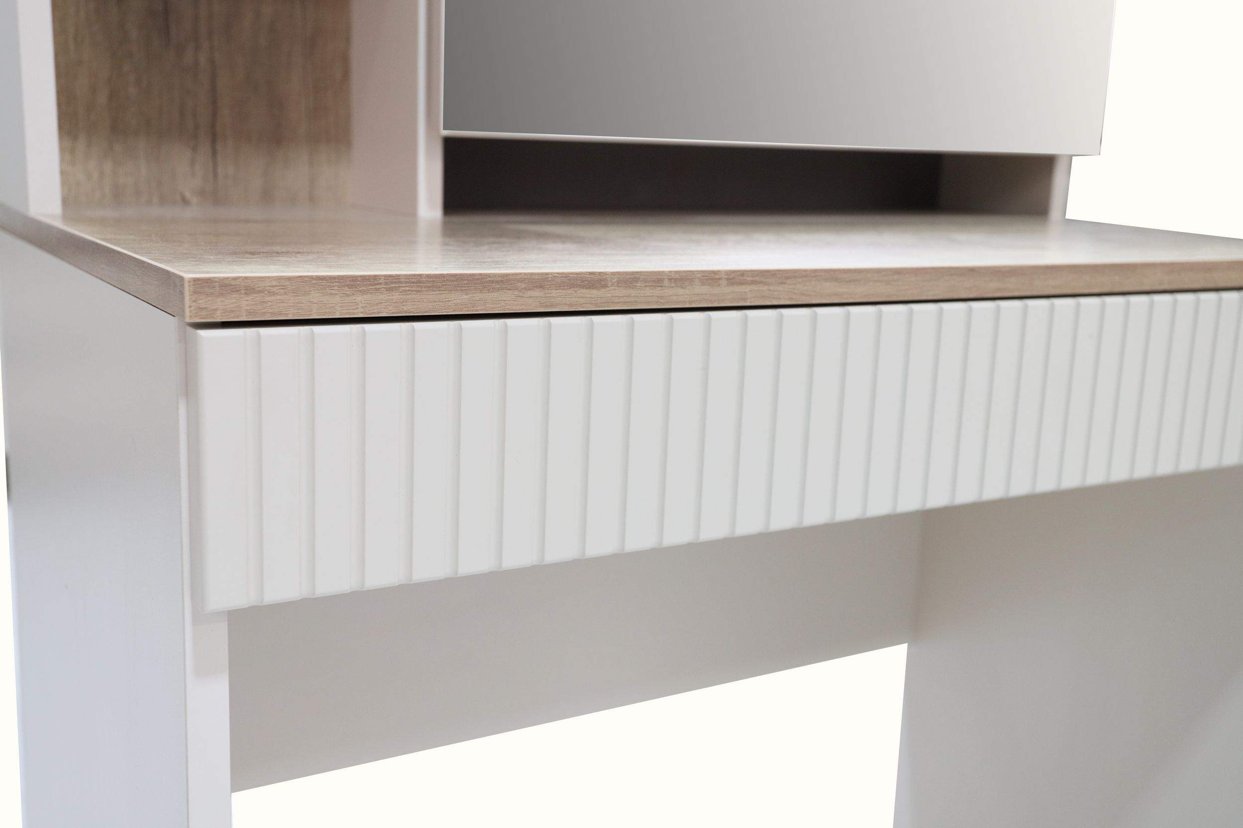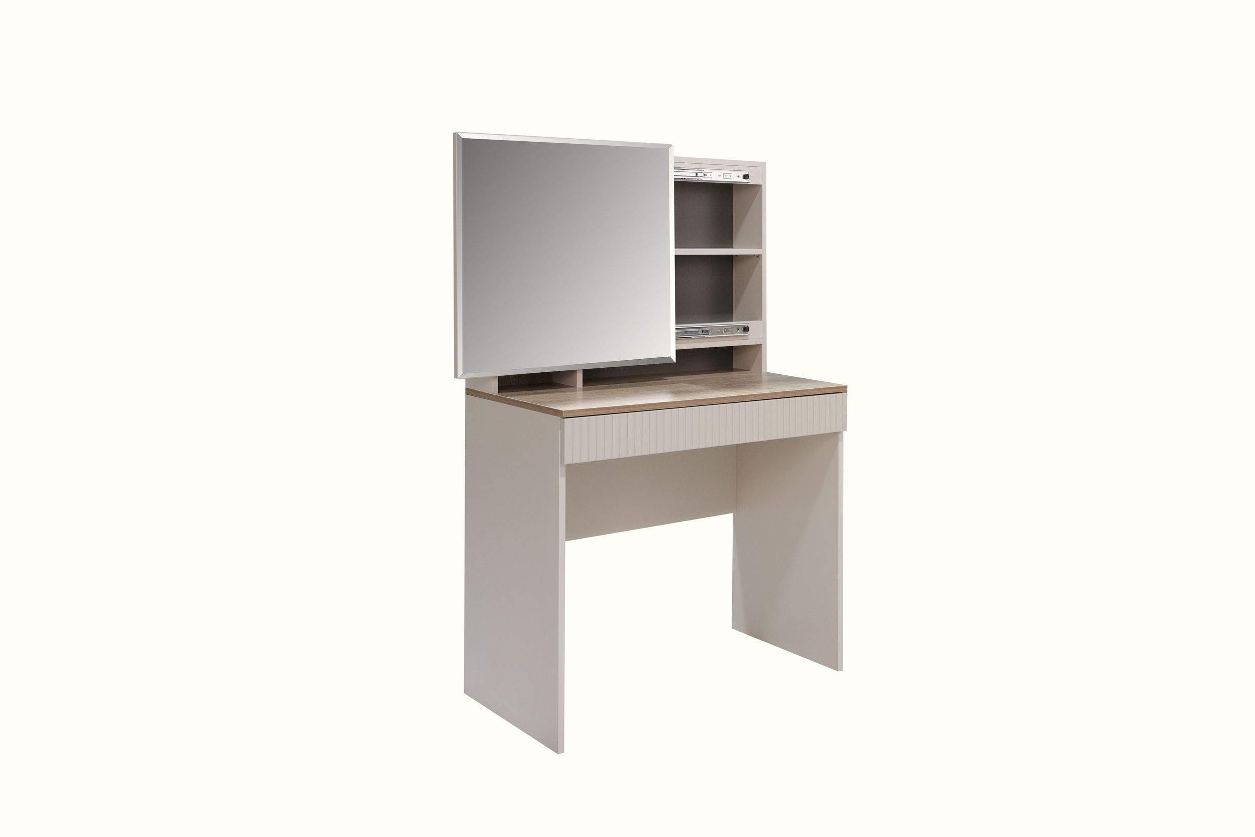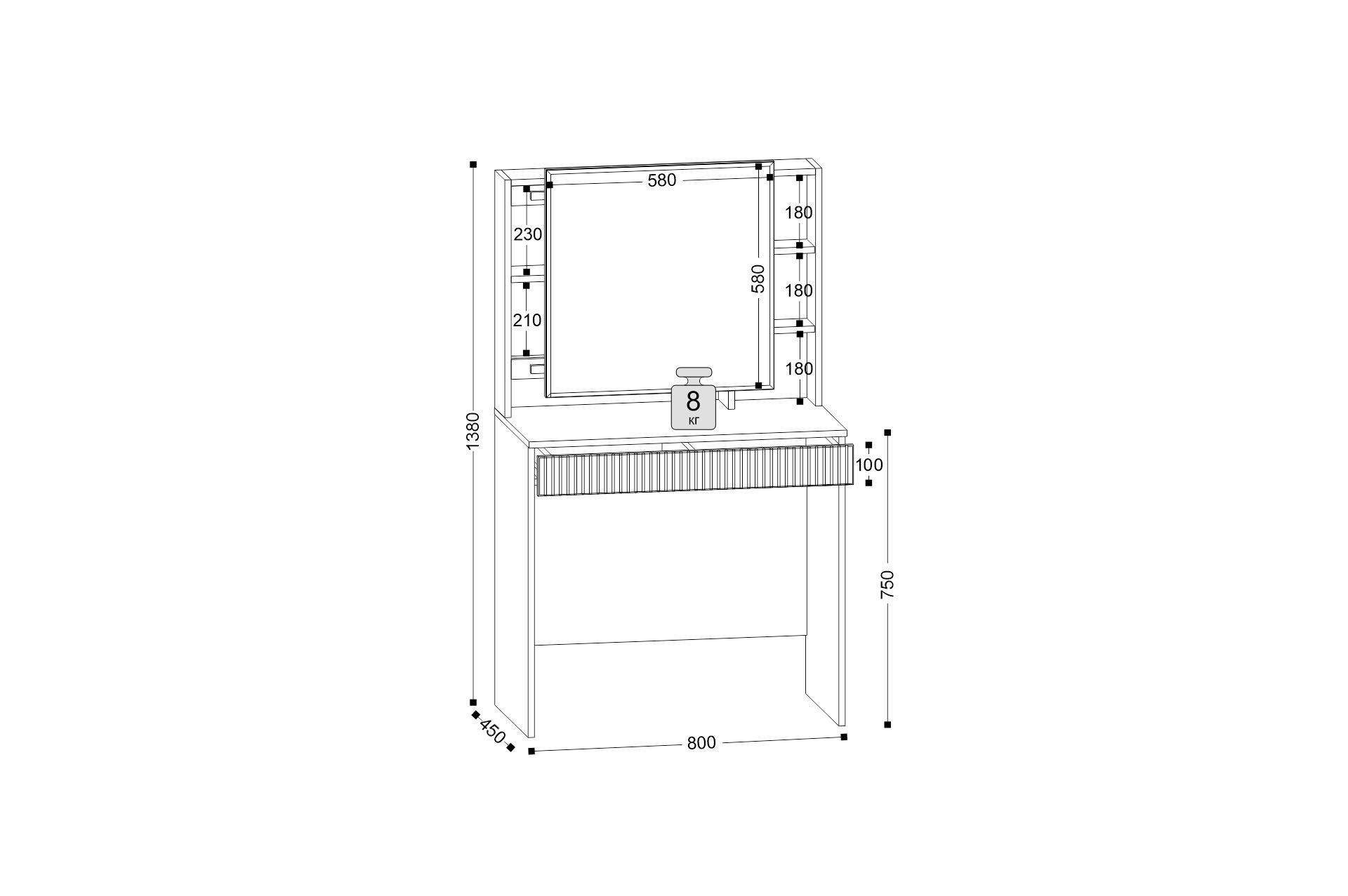 Размеры: 80x45, h138 cм. Изысканное трюмо оснащено передвижным зеркалом и скрытыми полками, спрятанными за ним, что обеспечивает удобство хранения косметики, украшений и аксессуаров. Выдвижной ящик дополнительно расширяет функциональность, позволяя хранить предметы под рукой.