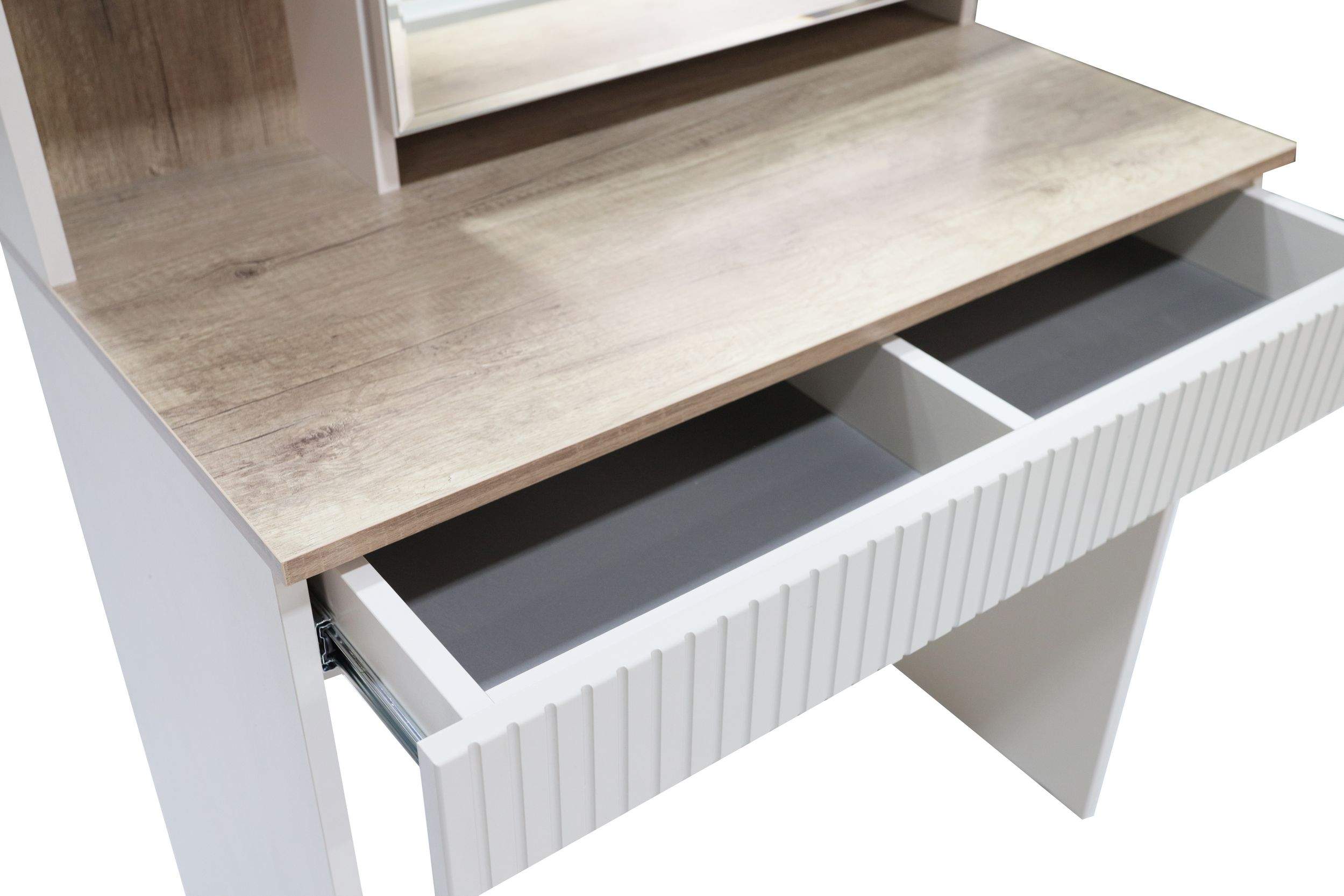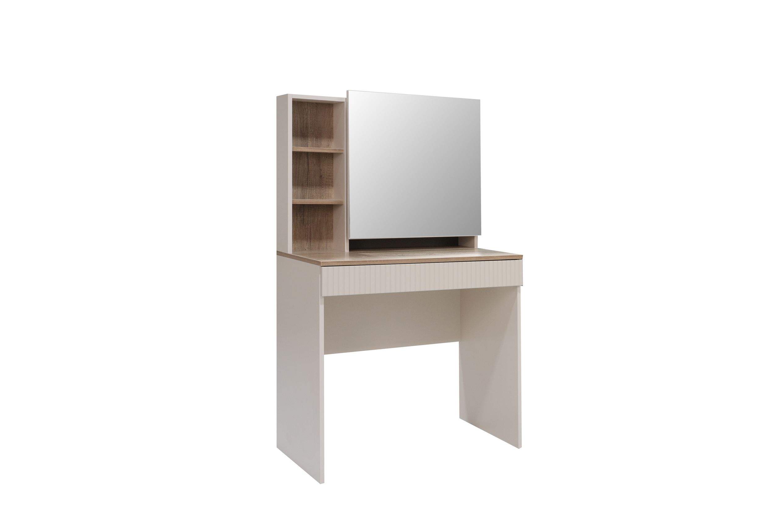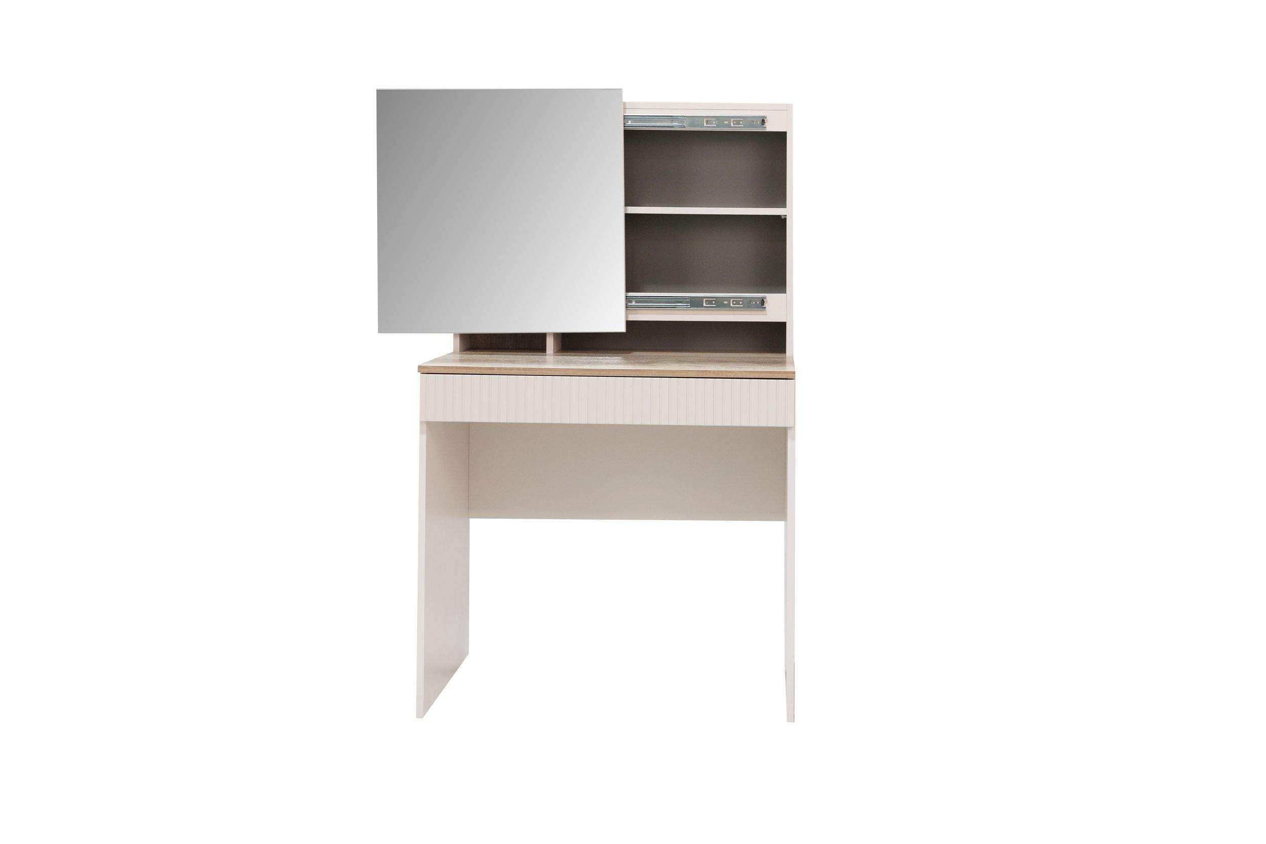 Размеры: 80x45, h138 cм. Изысканное трюмо оснащено передвижным зеркалом и скрытыми полками, спрятанными за ним, что обеспечивает удобство хранения косметики, украшений и аксессуаров. Выдвижной ящик дополнительно расширяет функциональность, позволяя хранить предметы под рукой.