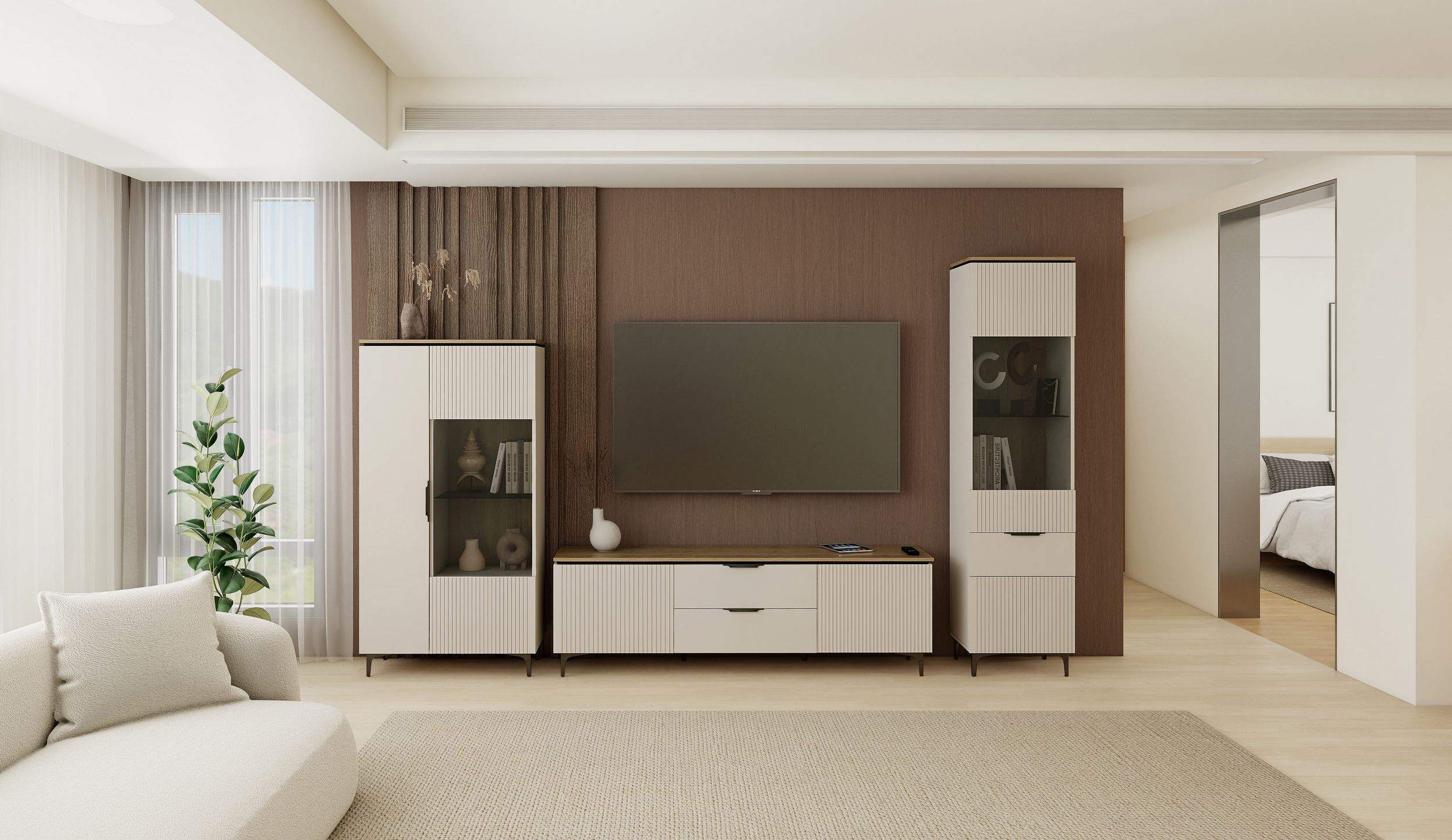 Размеры: 300x300, h200 cм. Комплект состит из: Тумба ТВ-1 (1800х400, h570 мм), Шкаф-витрина (50х400, h2000 мм), Шкаф-витрина 2 (830х400, h1600 мм).