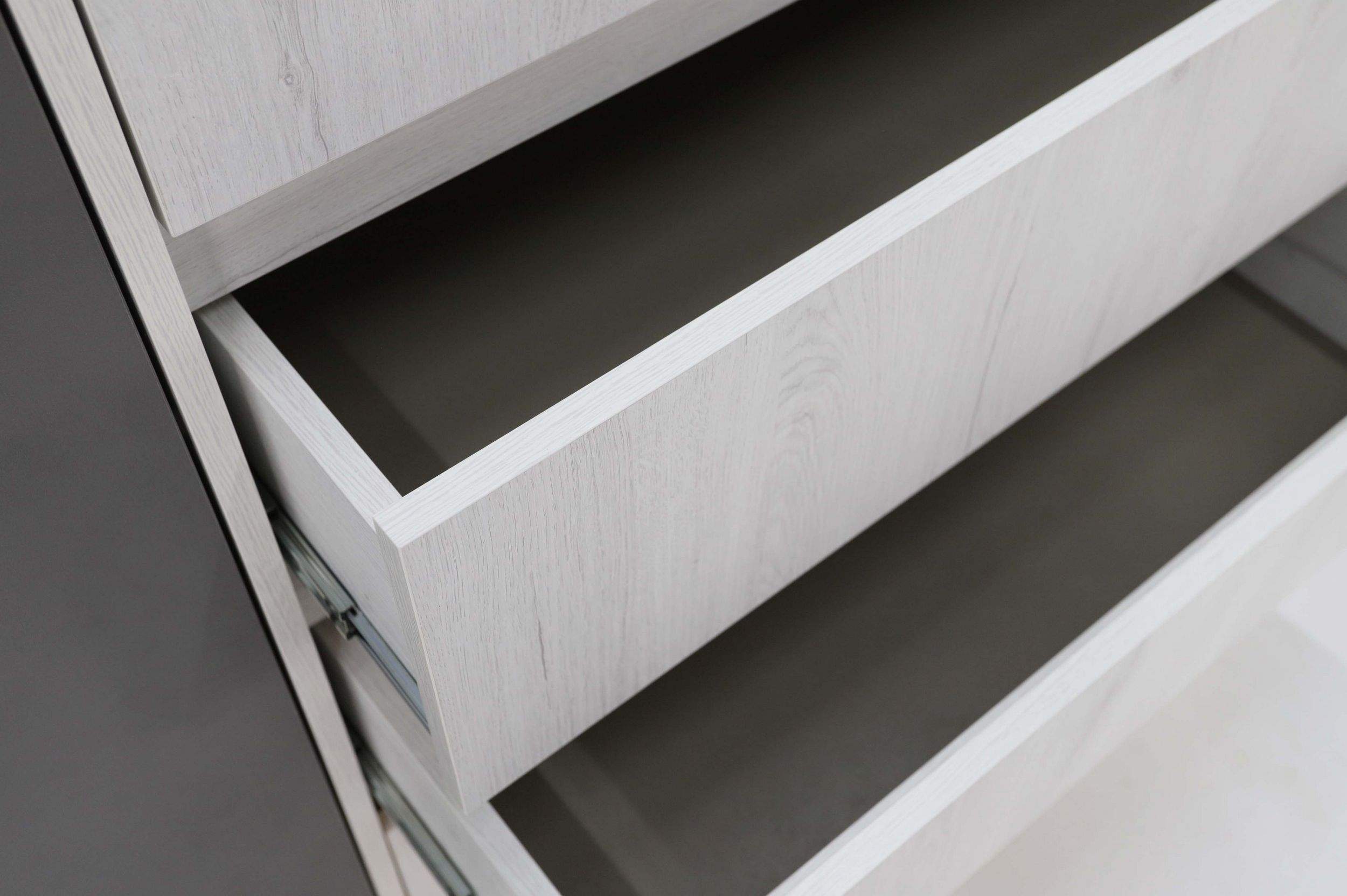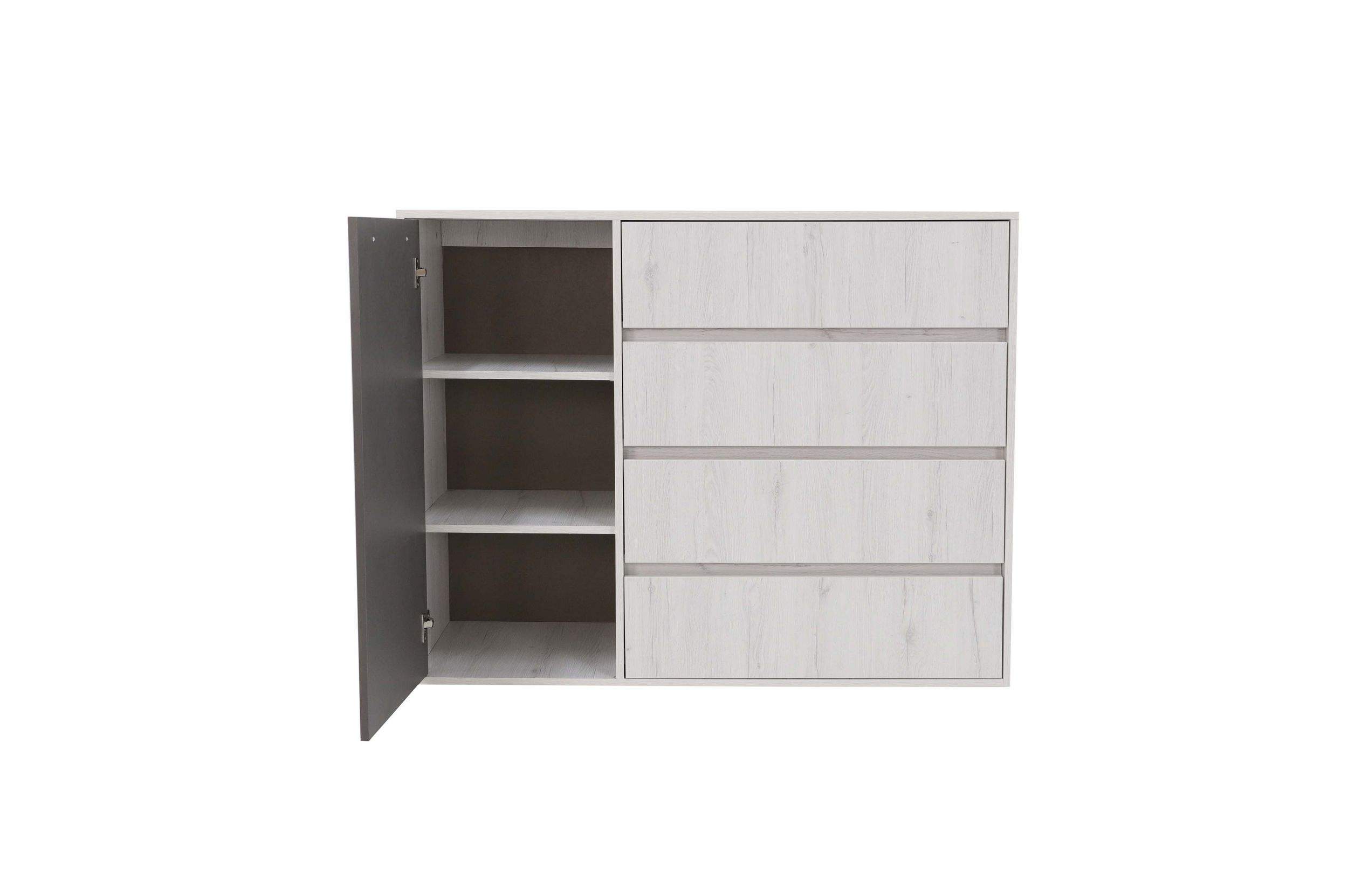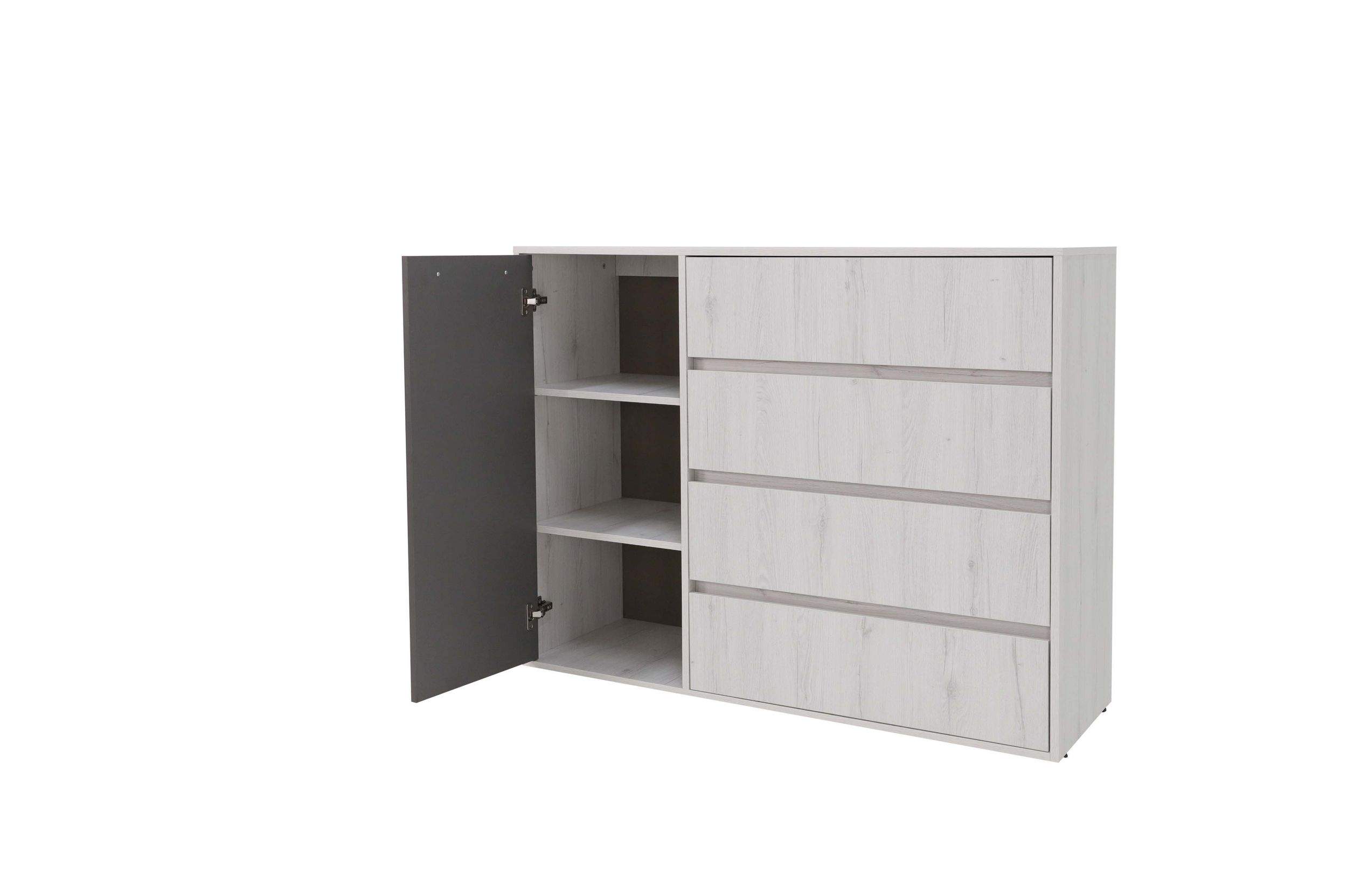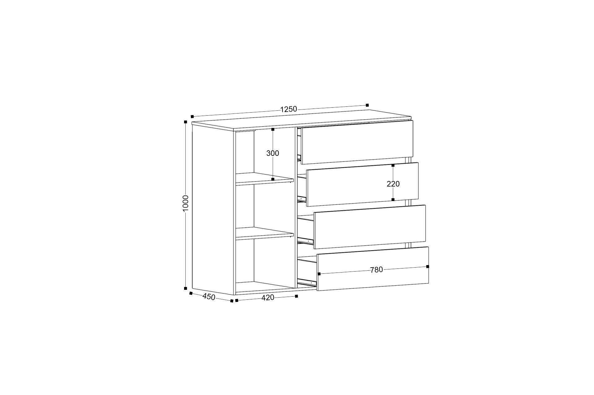Размеры: 125x45, h100 cм. Комод сделан в современном стиле для подростковой комнаты. 4 выдвижных ящика могут уместить в себя достаточно большое количество вещей, а 3 дополнительные полки помогут скрыть оставшийся визуальный шум.