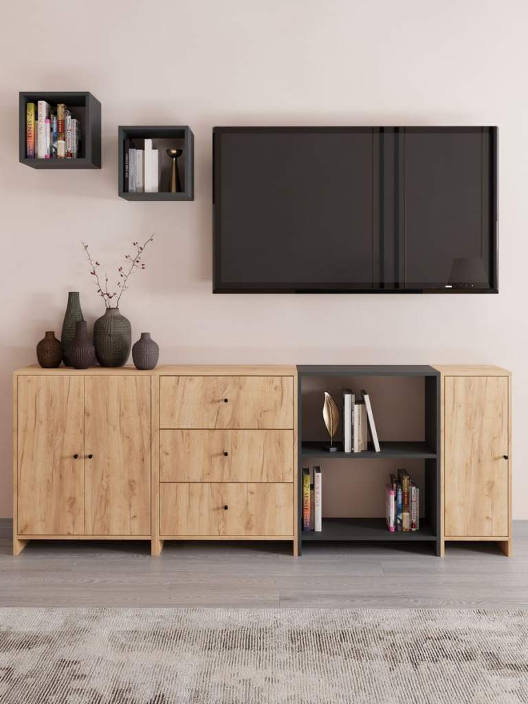 Комплект на фото состоит из: Тумба Тетрис 600 (600x300, h776 мм), Комод Тетрис 600 №3 (600x300, h776 мм), Стеллаж Тетрис 600 (600x300, h776 мм), Надстройка Тетрис 600 (600x300, h300 мм), Тумба Тетрис 300 (300x300, h776 мм), Надстройка Тетрис 300 - /2шт./ (300x300, h300 мм). Тумба под телевизор дуб золотой – это стильное и функциональное решение для вашего интерьера. Изготовленная из качественного древесного материала, она сочетает в себе элегантный дизайн и практичность. Тумба идеально впишется в любой интерьер, добавляя ему теплоту и уют.