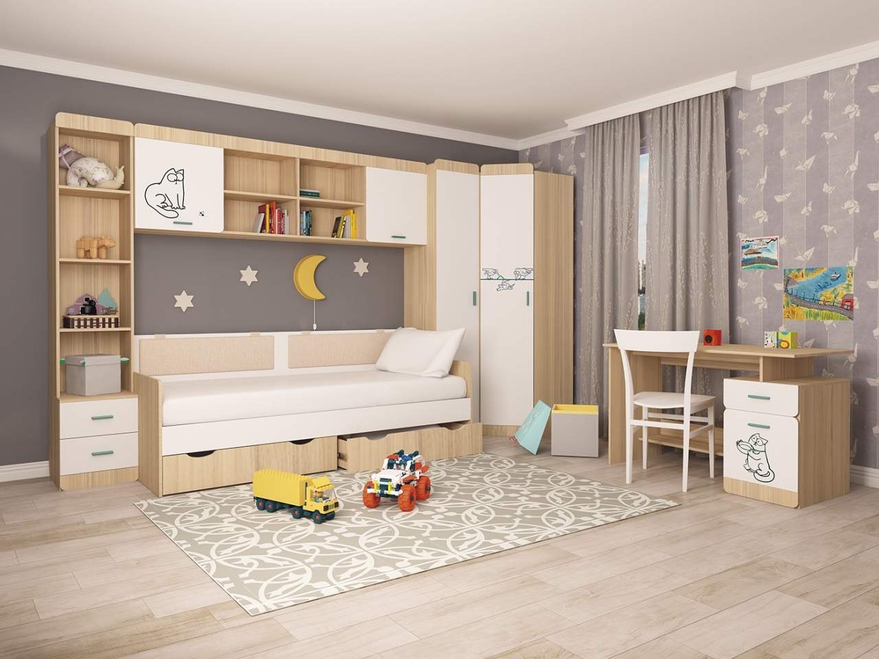 Детская модульная система Киса от компании Шагус одна из самых популярных на рынке. Почему? Взгляните на фасады этой мебели, кого вы там видите? Да! Это Киска! Все любят животных и дети и взрослые. Серии мультфильмов про животных подтолкнули наших дизайнеров на создание этой модульной системы мебели. А теперь о главном. Качество мебели Киса на высоком уровне, благодаря материалам которые используют в ее создании. Корпуса мебели выполнены из ЛДСП цвета Туя Светлая, Кромка используется как пластик 0,4мм так и кромка АБС 2мм. Фасады изготовлены из МДФ покрытого белой пленкой, а рисунок на них нанесен посредством ультрафиолетовой печати. Ящики оснащены шариковыми направляющими полного выдвижения. Петли на створках имеею доводчики, а значит они не будут отбиваться об корпус и шуметь. На подъемные створки установлены газлифты. Еще одной особенностью системы является о, что в комплекте предусмотрены 2 варианта ручек, оранжевого и бирюзового цветов. Вы можете выбрать их цвет в момент сборки, или менять в зависимости от настроения или времени года. В составе детской Кот большое количество элементов. Шкафы Пеналы Стеллаж Большой угловой шкаф Письменный и компьютерный столы Навесные полки 3 варианта кроватей Кровать для двоих детей Ваш ребенок мечтает о домашнем животном , но вы не можете это ему позволить? Украсьте его комнату детской модульной системой Киса и ваш ребенок будет вам безмерно благодарен. Большое количество позитивных эмоций достанется каждому посетителю такой комнаты.