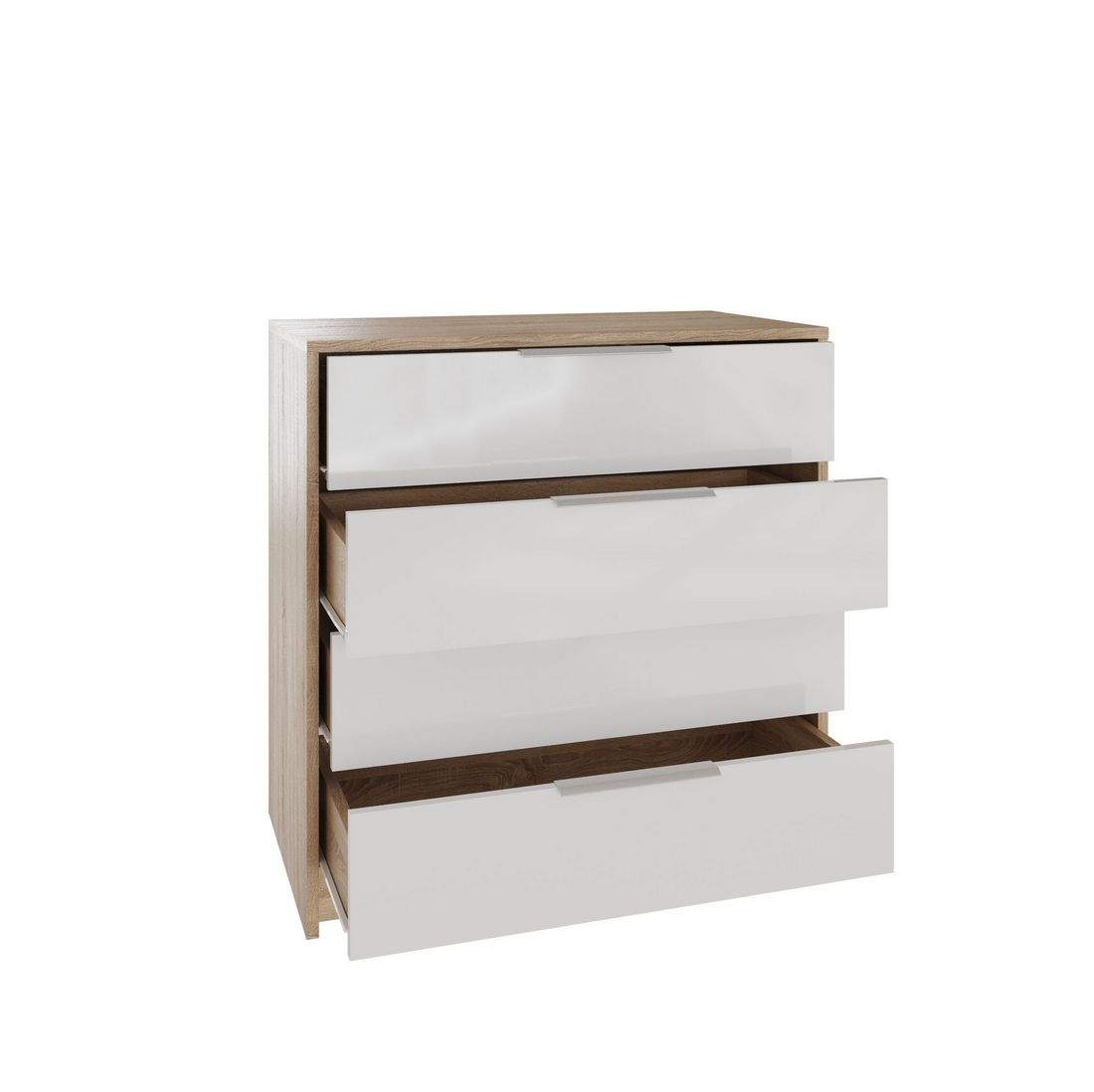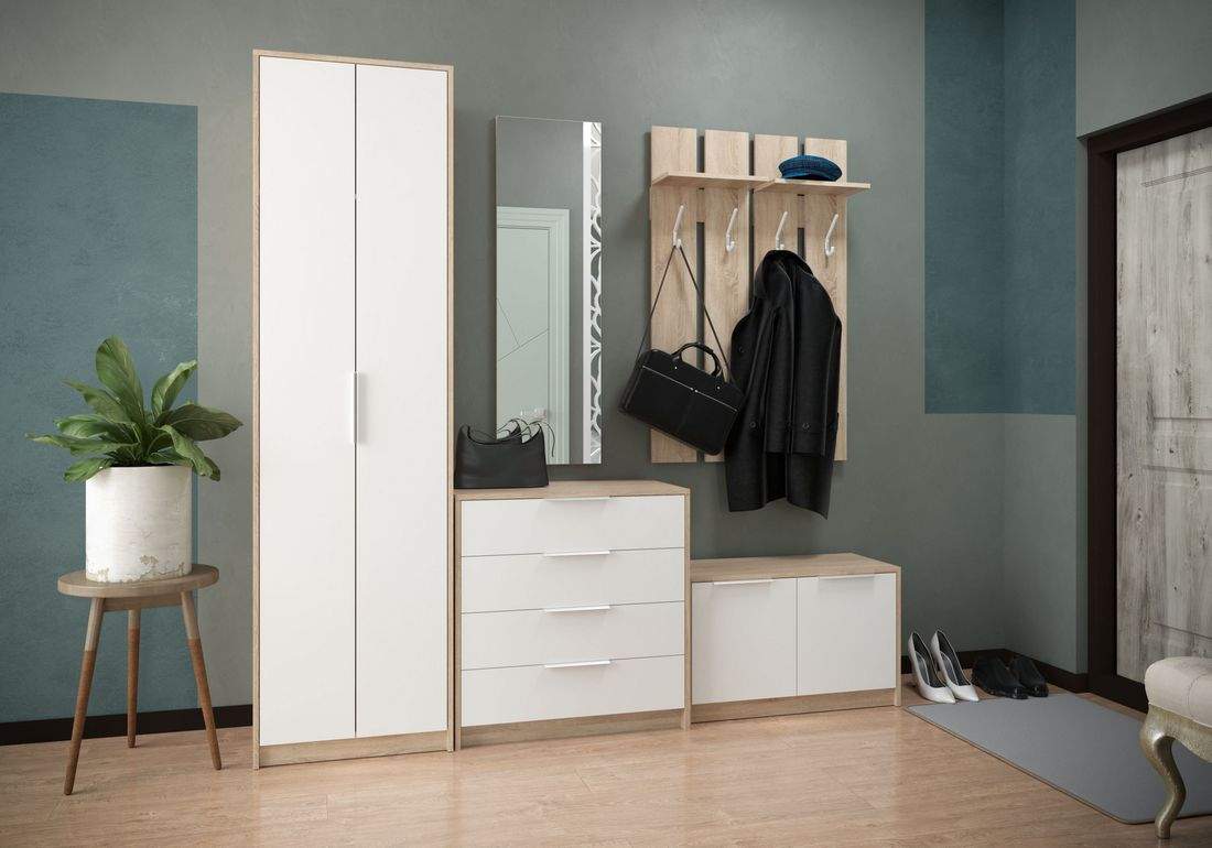 Комплект состоит из:Шкаф 2-х створчатый с выдвижной штангой (587х450, h2110 мм), Комод с 4-мя ящиками (770х445, h 790 мм), Зеркало навесное (380х20, h 1230 мм), Вешалка навесная (380х210, h 1230 мм) - 2 штуки, Тумба низкая (803х360, h490 мм).