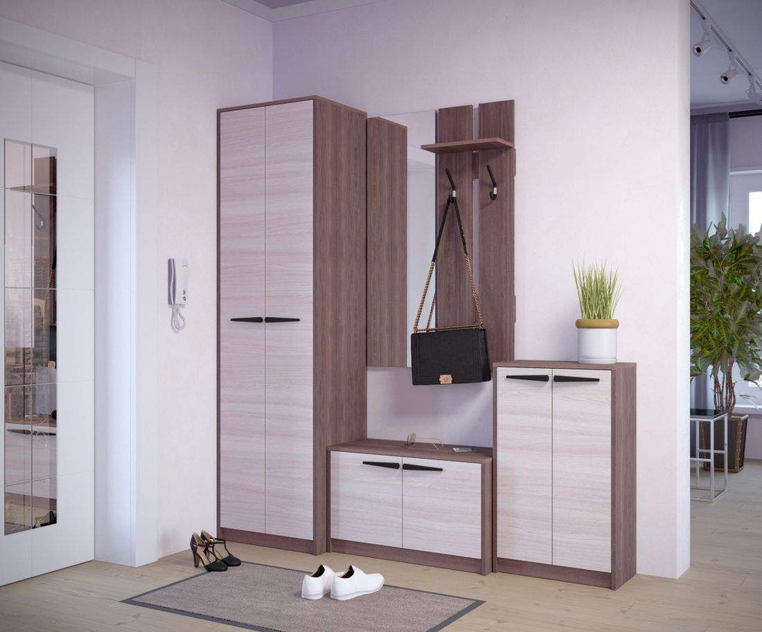 Комплект состоит из:Шкаф 2-х створчатый с выдвижной штангой (587х450, h2110 мм), Тумба для обуви низкая (803х360, h490 мм), Тумба для обуви высокая (535х 300, h 900 мм), Вешалка навесная (380х 210, h 1230 мм).