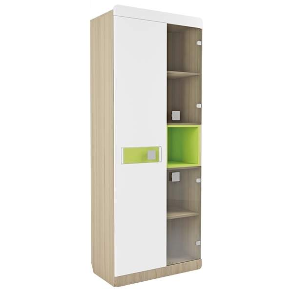 Стеллаж со стеклом Луиза из коллекции мебели для детской "Стиль" имеет отделение с глухим фасадом и отделение со стеклянными дверцами. Пенал может использоваться для размещения книг, учебных принадлежностей, игрушек, сувениров или других вещей. Комплектуется полками. Глухой фасад декорирован цветной вставкой и фрезеровкой. Входит в набор для детской Луиза Материал корпуса: ЛДСП 16 мм. Материал фасадов: МДФ 16 мм, пленка "глянец", стекло. Кромка ПВХ 0,4 мм. Декоративный элемент: МДФ 3 мм, пленка "глянец". Фурнитура: петли с доводчиками, ручки пластиковые.