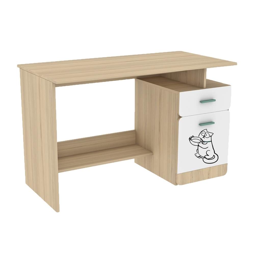Письменный стол Киса удобен для занятий ребенка, так как имеет широкую столешницу и подставку под ноги. Стол оборудован тумбой с распашной дверцей и выдвижным ящиком для канцелярских принаджлежностей. Комплектуется ручками двух цветов. Стол идеально подойдет в комнату школьника.Ящик оснащен шариковыми направляющими полного выдвижения Материал корпуса и фасадов: ЛДСП 16 мм. Кромка ПВХ 0,4 мм. Фурнитура: петли с доводчиками, направляющие ящиков шариковые полного выдвижения, ручки пластиковые