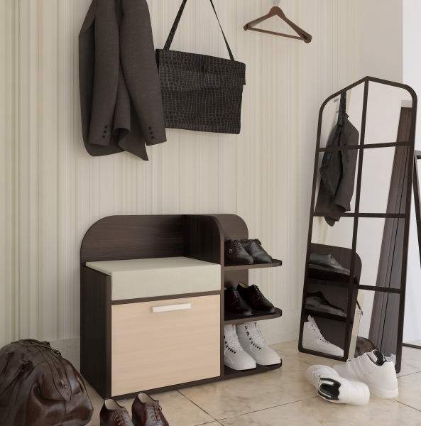 Тумба для обуви с мягким сиденьем Мини - это современная, функциональная, компактная тумба для прихожей. Тумба имеет мягкое сиденье, под ним находится отеление с дверкой для обуви, с боку расположены три открытые полки. Практичная и удобная тумба с мягким сиеньем, благодаря своим компактным размерам, не занимает много места, хорошо подходит для любого помещения. Изготовлена из качественного ЛДСП