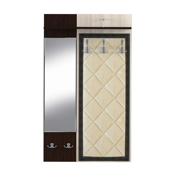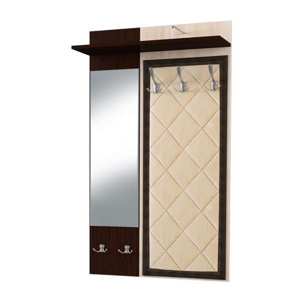 Вешалка настенная с зеркалом Кристина предназначена для размещения одежды и головных уборов в прихожей. Вешалка оборудована зеркалом, комплектуется полкой, крючками для одежды и сумок. Отличительной особенностью модуля является декоративная панель, отделанная простроченной экокожей "Аэро" бежевого и кофейного цвета. Материал корпуса: ЛДСП 16 мм. Кромка ПВХ 0,4 мм. Зеркало обработано фацетом. Мягкие элементы: экокожа.
