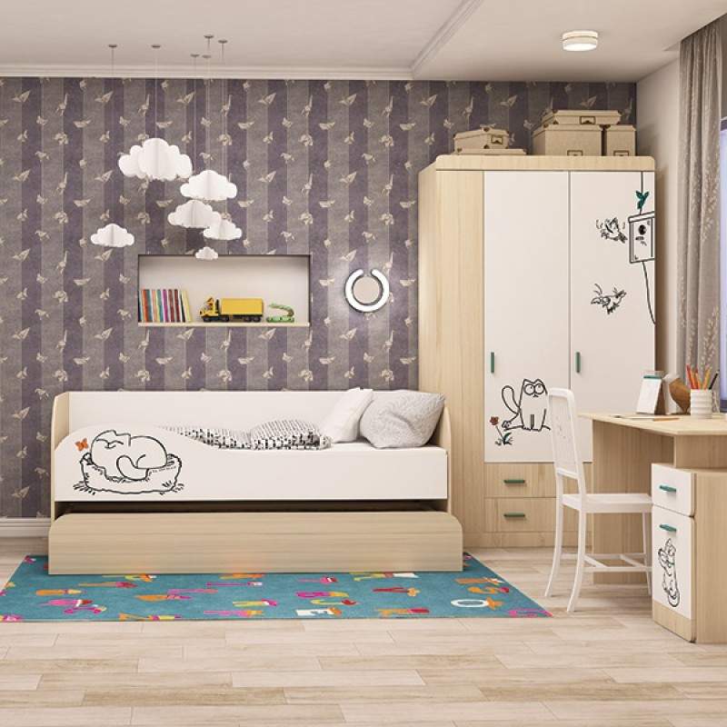 Комплект состоит из:Кровать раздвижная Киса КР-3 (Размеры: 1932x937, Н800 мм), Шкаф трехдверный Киса ШК-3 (Размеры:1150х516, Н2040 мм), Стол письменный Киса (Размеры: 1200х650, Н750 мм).