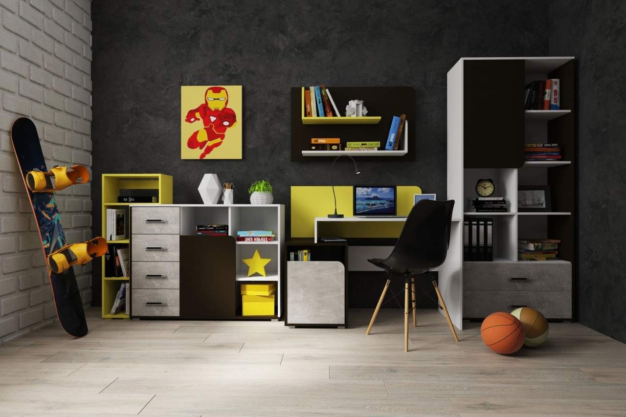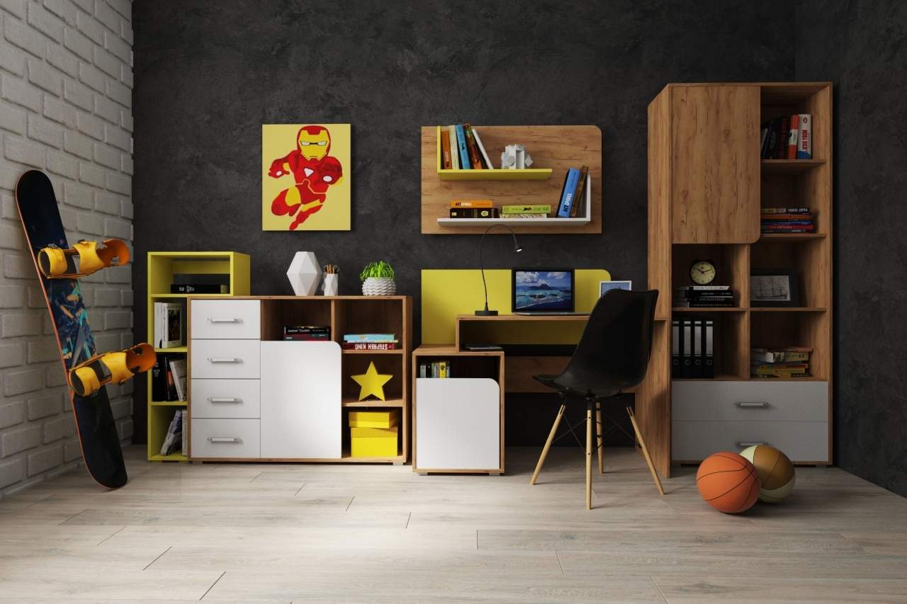 Комплект состоит из: Стол письменный Мартин (Размеры:1200х585, h1000 мм), Шкаф открытый Мартин (Размеры:904x374, h1900 мм), Полка навесная Мартин (Размеры:1000x220, h600 мм), Комод Мартин (Размеры:1104x374, h850 мм), Полка приставная Мартин (Размеры:440x250, h1080 мм).
