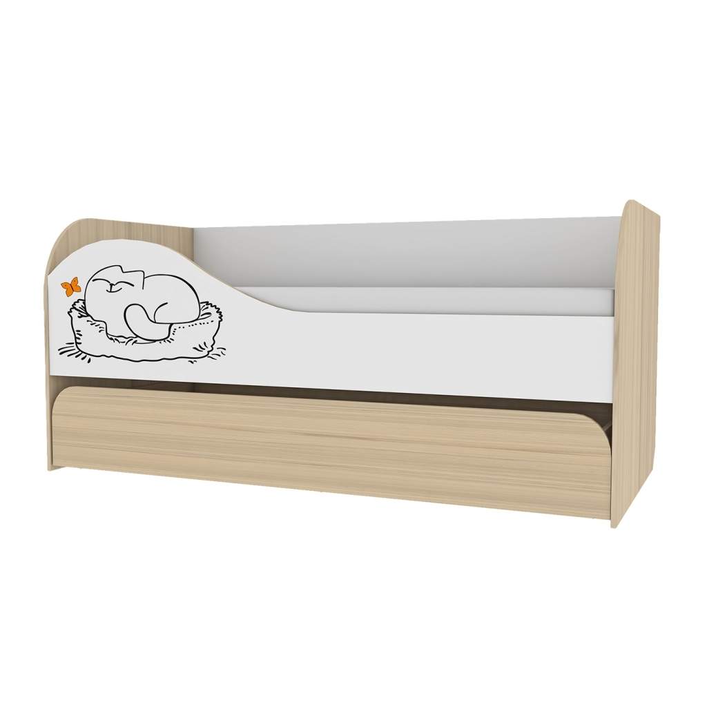 Детская кровать Киса Кр-3 имеет очень интересную и многофункциональную конструкцию. Кровать состоит из двух блоков, верхнего стационарного и выдвигающегося нижнего. Такую кровать можно использовать для двоих детей или же как кровать с большим ящиком для белья, игрушек или прочих мелочей. Изображение спящей "Кисы" на изголовье добавляет шарма кровати. Дети и подростки любят мультяшный зверушек, а значит кровать придется им по вкусу.Высота от пола до основания спального места: 400 мм. В основании щит ЛДСП. Матрас для кровати приобретается отдельно.
