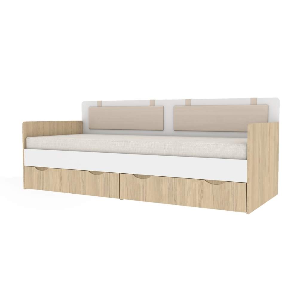 Кровать-тахта Киса 900 КР-2из коллекции мебели для детской "Киса" имеет высокие спинки, комплектующиеся мягкими элементами. В дневное время кровать можно использовать как диван в детской комнате. Под спальным местом располагаются вместительные выдвижные ящики - дополнительное место для хранения разнообразных вещей ребенка. В основании кровати щит ЛДСП. Высота от пола до основания спального места - 310 мм. Материал каркаса: ЛДСП 16 мм. Кромка ПВХ 0,4 мм. Мягкие элементы: ткань "Гудлак 3", ППУ 40 мм. Фурнитура: направляющие ящиков шариковые полного выдвижения.