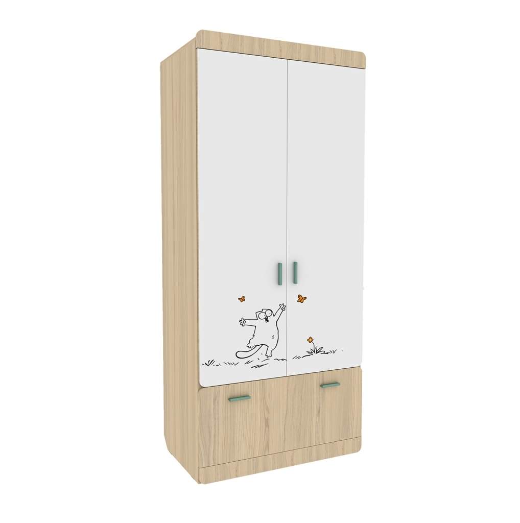 Хотите купить необычный шкаф в детскую ? Эта модель отличный вариант . Шкаф двухдверный Киса ШК-2 имеет антресольную полку и две секции: одна секция комплектуется штангой для вешалок, вторая - полками для белья. В нижней части шкафа расположен объемный ящик для постельного белья или других детских вещей. Забавный принт на фасадах создает жизнерадостную атмосферу в комнате ребенка. Прилагаются ручки двух цветов на выбор. Материал корпуса и фасадов: ЛДСП 16 мм. Кромка ПВХ 0,4 мм. Фурнитура: петли с доводчиками, направляющие ящиков шариковые полного выдвижения, ручки пластиковые