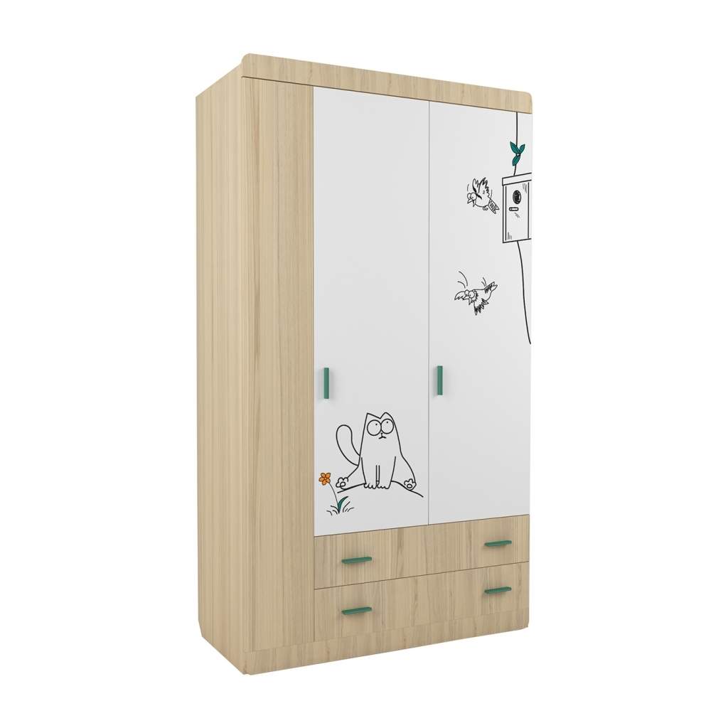 Шкаф трехдверный Киса ШК-3, это большой двухстворчатый шкаф с распашными дверцами и двумя выдвижными ящиками с плавными направляющими. Корпус изготовлен из ЛДСП, фасады МДФ. Ручки окрашены в два цвета бирюзовый и оранжевый. На белых фасадах нанесено изображение Кисы и птичек. За распашными дверьми два отделения, с полками с правой стороны и со штангой с левой. Так же с левой стороны предусмотрено место для того что бы разместить длинные платья или верхнюю одежду. Фурнитура: петли с доводчиками, направляющие ящиков шариковые полного выдвижения, ручки пластиковые.