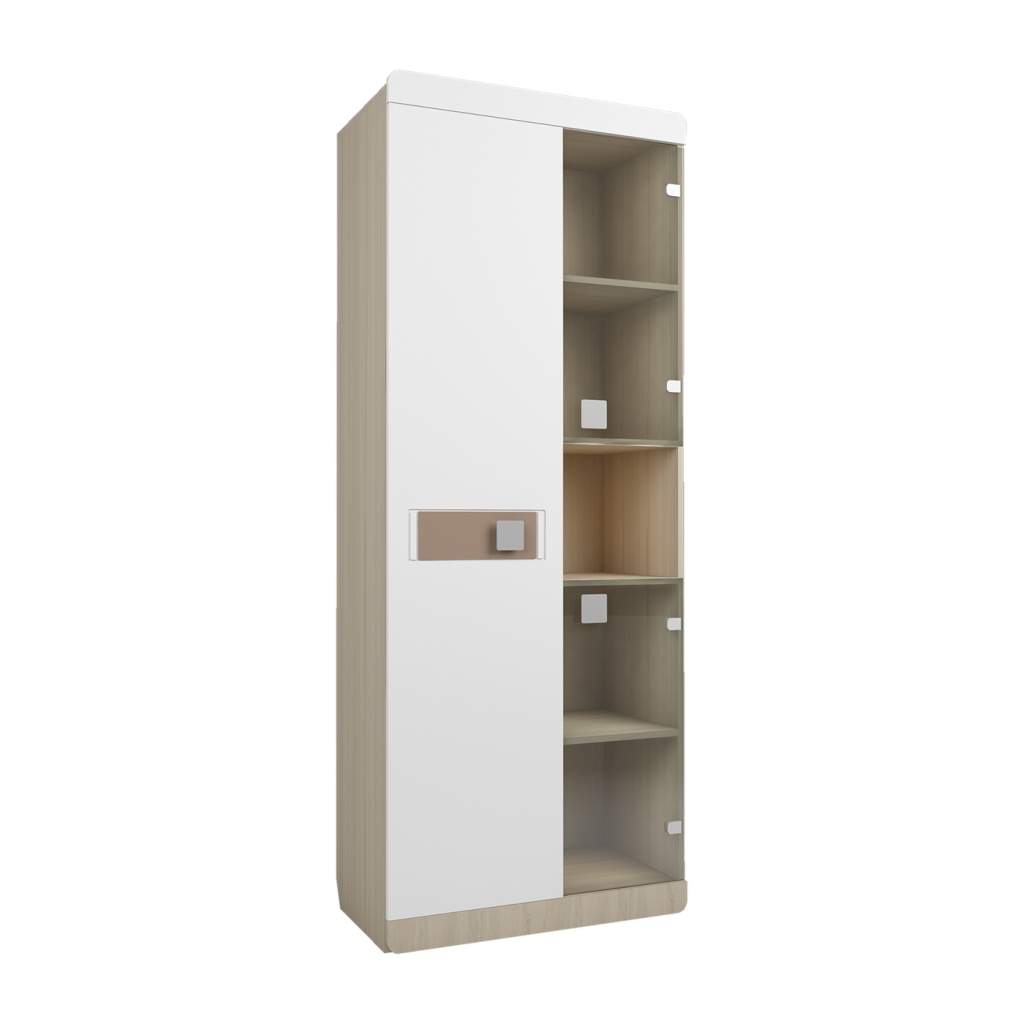 Стеллаж со стеклом Луиза из коллекции мебели для детской "Стиль" имеет отделение с глухим фасадом и отделение со стеклянными дверцами. Пенал может использоваться для размещения книг, учебных принадлежностей, игрушек, сувениров или других вещей. Комплектуется полками. Глухой фасад декорирован цветной вставкой и фрезеровкой. Входит в набор для детской Луиза Материал корпуса: ЛДСП 16 мм. Материал фасадов: МДФ 16 мм, пленка "глянец", стекло. Кромка ПВХ 0,4 мм. Декоративный элемент: МДФ 3 мм, пленка "глянец". Фурнитура: петли с доводчиками, ручки пластиковые.
